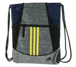 Adidas? perfect sling sackpack bag for gym, sleepover, school or your next workout. The Alliance Sport Sackpack is the perfect team sackpack. There is one large compartment with drawstring closure complete with air mesh ventilation. This sackpack has a front zippered valuables pocket that is lined with soft tricot fabric. There are also two side mesh pockets that are deep enough to fit water bottles, gym clothes, whatever you need to carry. The adidas embroidered brandmark and the screen-printed signature 3-Stripes complete the design of the Alliance Sport. Made of 100% Polyester dobby. Measures: 14"L x 18.75"H. Lifetime Warranty. Color: 10 Color Choices. Alliance- Large compartment with drawstring closure