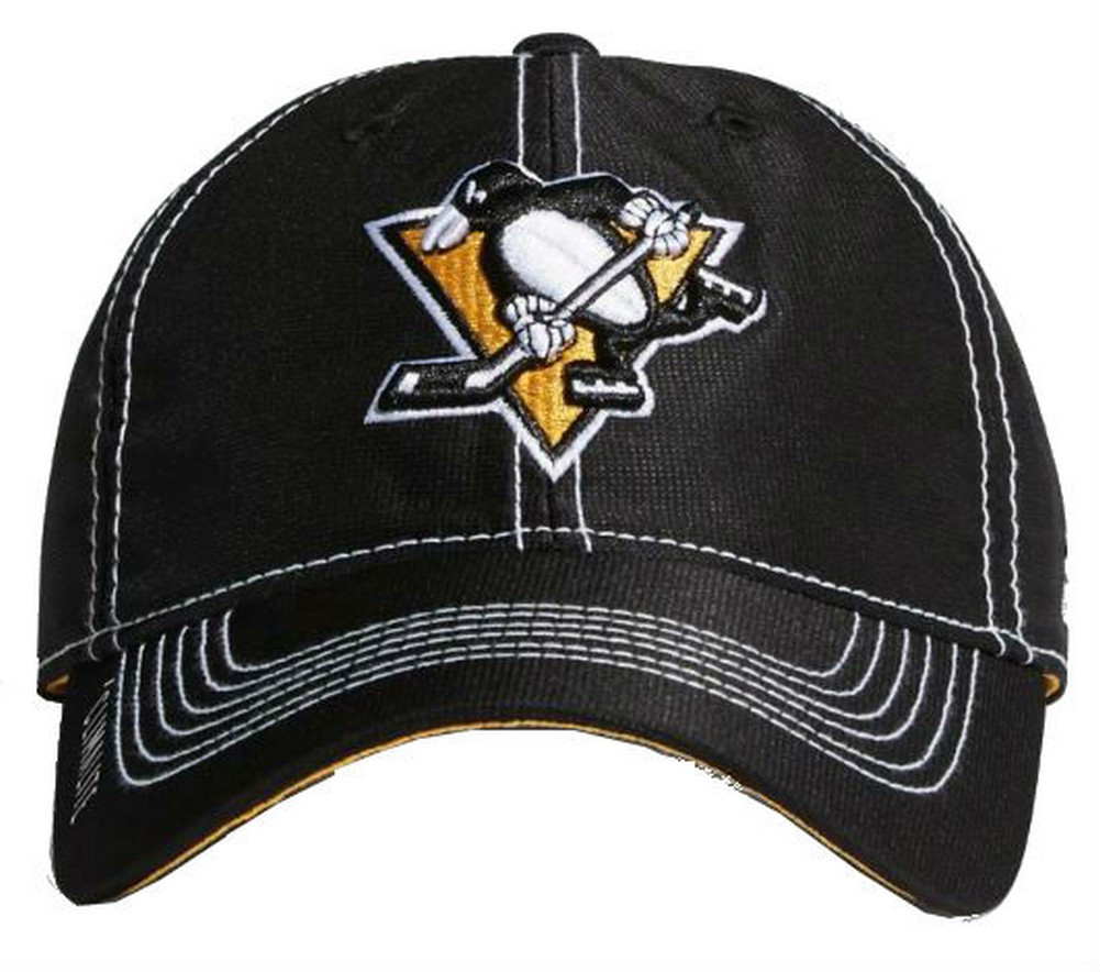 Celebrate the Penguins as they dominate the ice. This unstructured hockey hat features a wide, flexible brim, and it's made of textured, moisture-wicking Climalite fabric for breathability. An adjustable back strap with a buckle provides a personalized fit. Officially licensed by the NHL. Made of 100% Polyester. Color: Black/Gold/White. CY1107- One size fits most. Officially licensed by the NHL