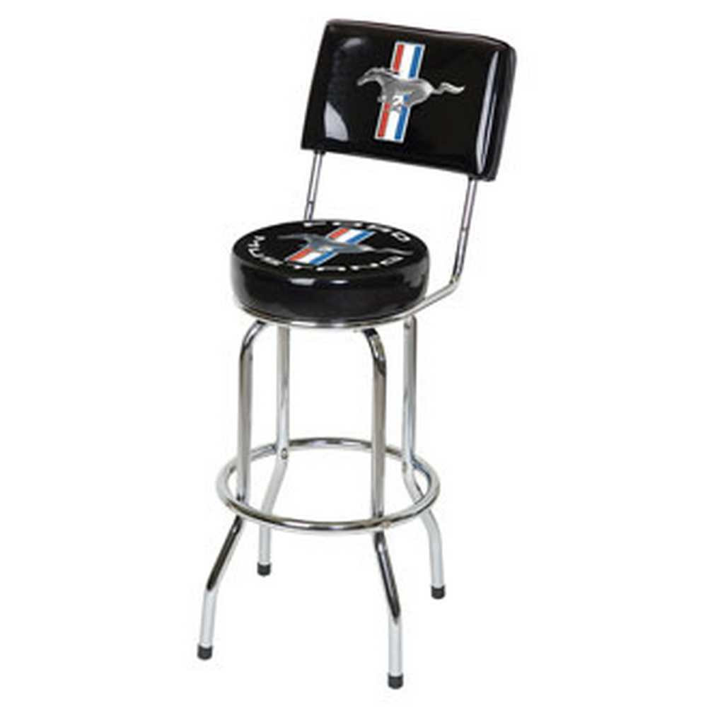 Celebrate the legend of the pony with this Mustang Backrest Bar Stool. Perfect for home or garage. Constructed from heavy gauge 1" tubular steel frames with lustrous chrome plated finish. Commercial grade vinyl covering screened on the underside so designs will not scratch off with use. Thick foam padded seats rotate on a 360 degree revolving swivel. Easy assembly required. Recommended for indoor use only.Dimensions: Seat height 30" Seat Diameter 14" Backrest Height: 42"