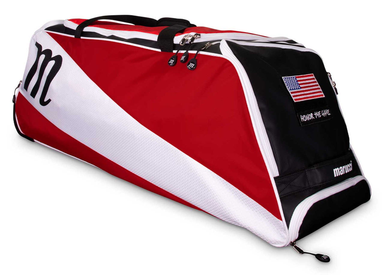Marucci Wheeled Utility Bag - Red/White, MBWHUB-R/W. No gear left behind. This heavy-duty Wheeled Utility Bag features an extra-large main compartment that easily fits all game and practice equipment while gear-specific compartments organize your bats, cleats and more. Each Wheeled Utility Bag comes standard with Honor The Game and USA Flag removable patches. Military-inspired hook-and-loop patch area provides unique personalization options. Heavy-duty wheeled design, with separate bat compartment storage for up to four bats with up to 2.75" barrels. Fully tarpaulin top and side panels provide extra water-resistance. Fits all game and practice gear, including catcher’s equipment in the main compartment. Ventilated cleat compartment and extra side zipper compartment. Rugged outdoor wheels are equipped for multiple terrain types and allow easy transport to and from the field. Durable neoprene pull handle provides a sturdy and comfortable grip. Molded plastic hook allows bag to easily hang on fence. Size: 38" W x 12" D x 12.5" H.- Each Wheeled Utility Bag comes standard with Honor The Game and USA Flag removable patches