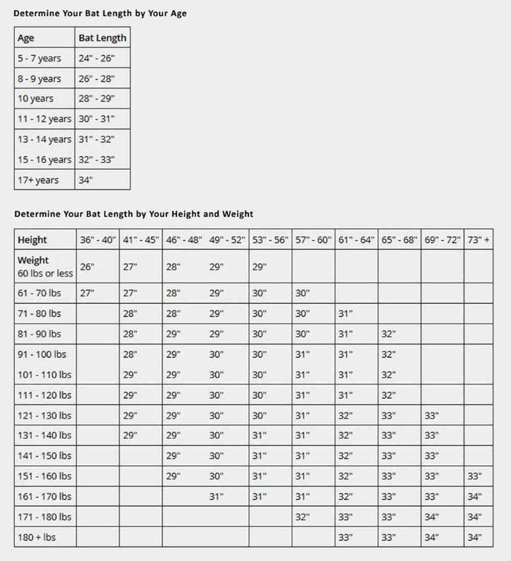 Use the chart below as a general guide to determine which bat size an athlete needs based on their age, height and weight.