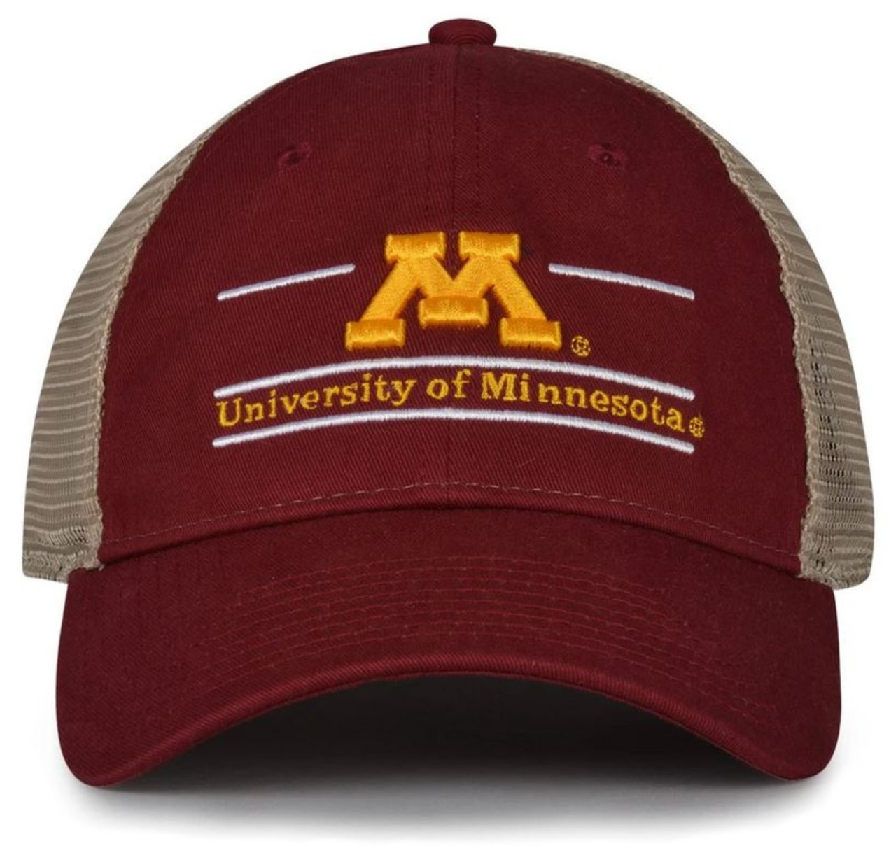 The Game University of Minnesota Golden Gophers ?M? Logo Split Bar Adjustable Cap, Maroon with Gold mesh, G180-CSP0035. Prove your worth as a University of Minnesota fan with this awesome Logo Split Bar Trucker adjustable hat from The Game! It's got four mesh panels along the back for added breathability and embroidered University of Minnesota graphics and ?M? logo across the crown. The snapback closure allows for easy adjustments that ensure the perfect fit every time. G180-CSP0035- Four mesh panels along the back for added breathability