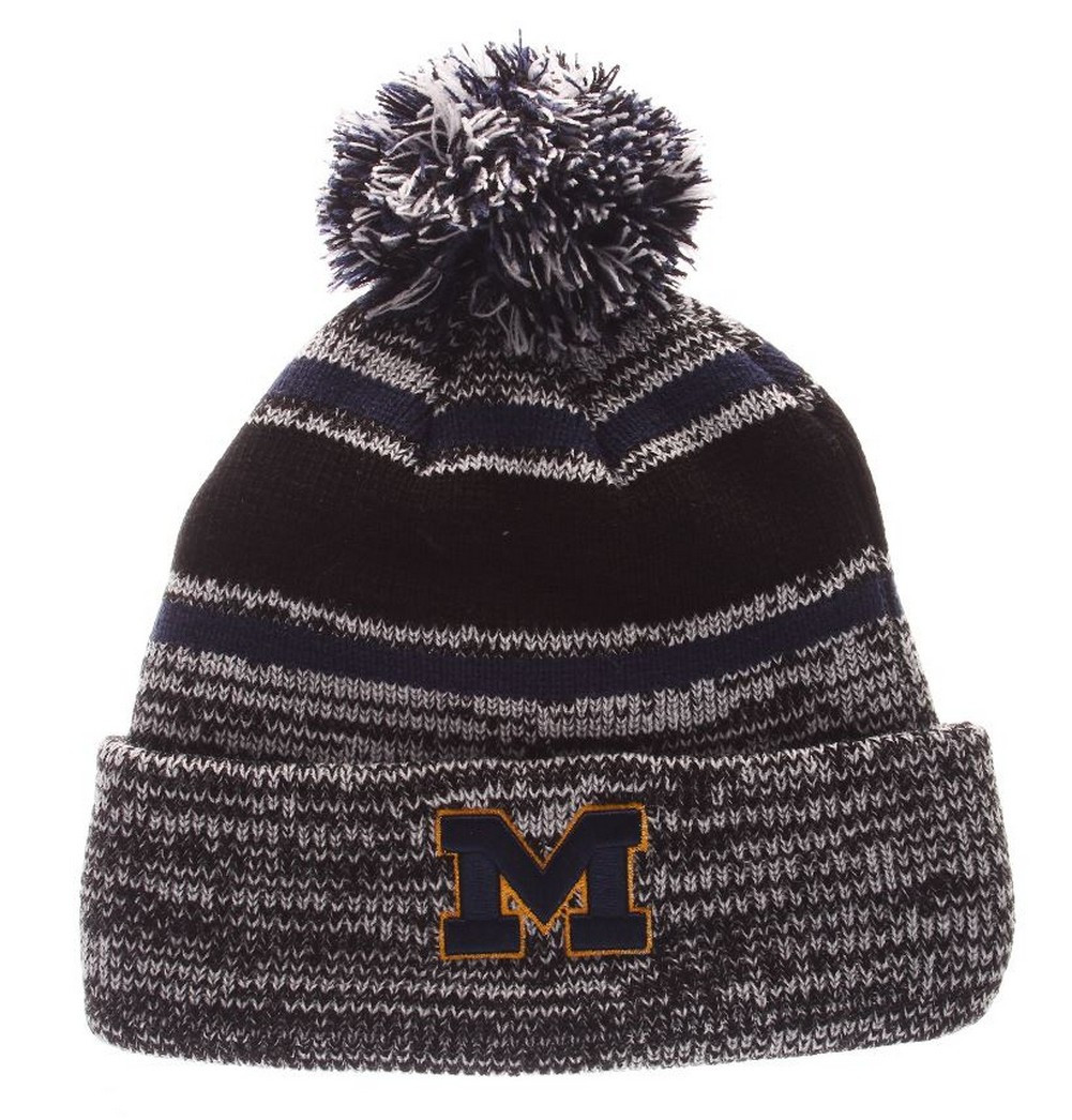 Show your support for your college team, University of Michigan Wolverines, with this "M" Granite logo knit cap. Cozy Acrylic knit with accent pompom on top and team logo on cuff. Zephyr Headwear was established in 1993 by former sports retailers who weren't satisfied with the hats they had to sell in their stores. Zephyr initially focused on improving college hats and quickly became a major hat company by innovating many of the styles and treatments that are common in headwear today. Know as "Z Hats" because of the embroidered "Z" on the left side of cap. Zephyr insists on the highest quality materials and innovative design to stand a hat above the rest! Officially Licensed. Color: Navy/Gray/White/Black. MCHKNT0010- Cuffed knit hat