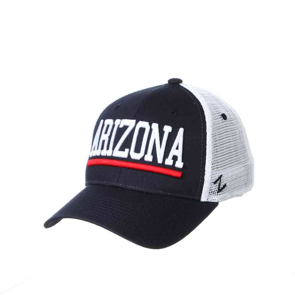 Show your support for your college team, University of Arizona cap design. This Cotton/Poly Blend adjustable cap with adjustable snap back closure by Zephyr. Zephyr Headwear was established in 1993 by former sports retailers who weren't satisfied with the hats they had to sell in their stores. Zephyr initially focused on improving college hats and quickly became a major hat company by innovating many of the styles and treatments that are common in headwear today. Know as "Z Hats" because of the embroidered "Z" on left side. Zephyr insists on the highest quality materials and innovative design to stand a hat above the rest! Officially Licensed. Color: Navy/White/Red. ARZUPT001001- Low Profile cap with solid front panels, mesh mid & rear panels